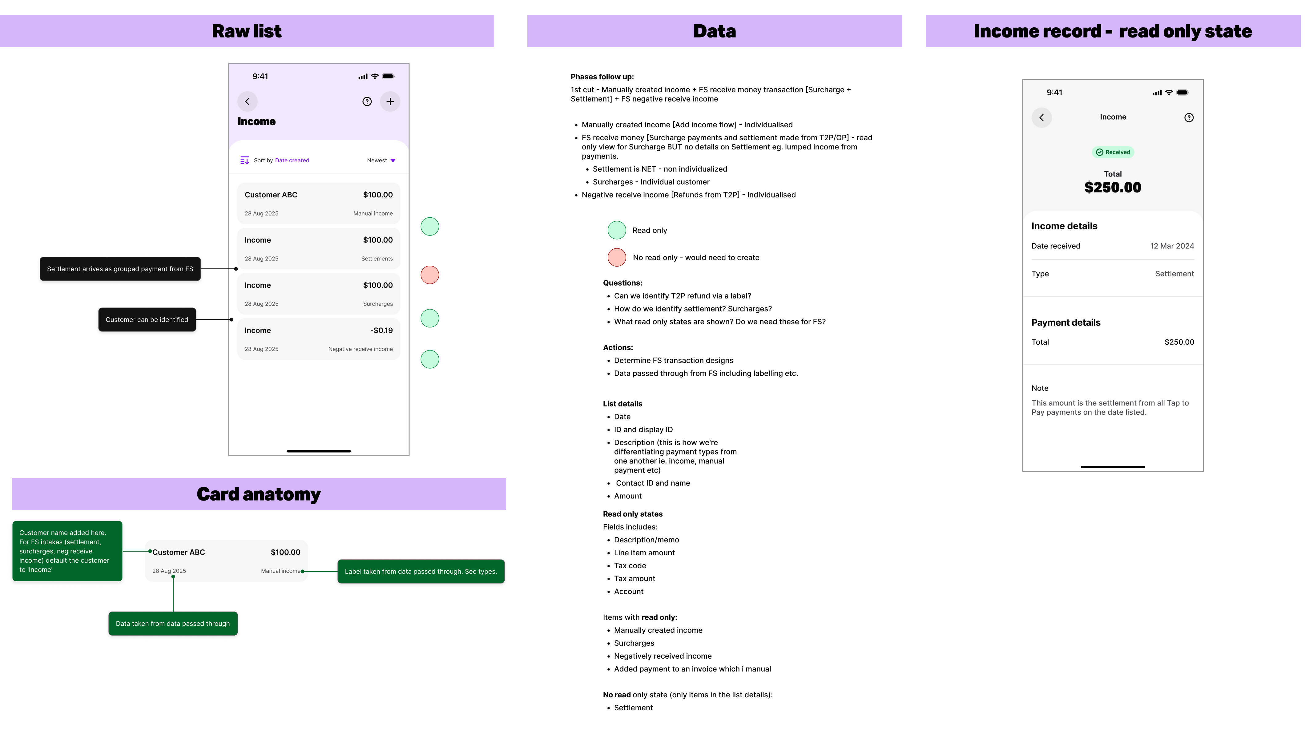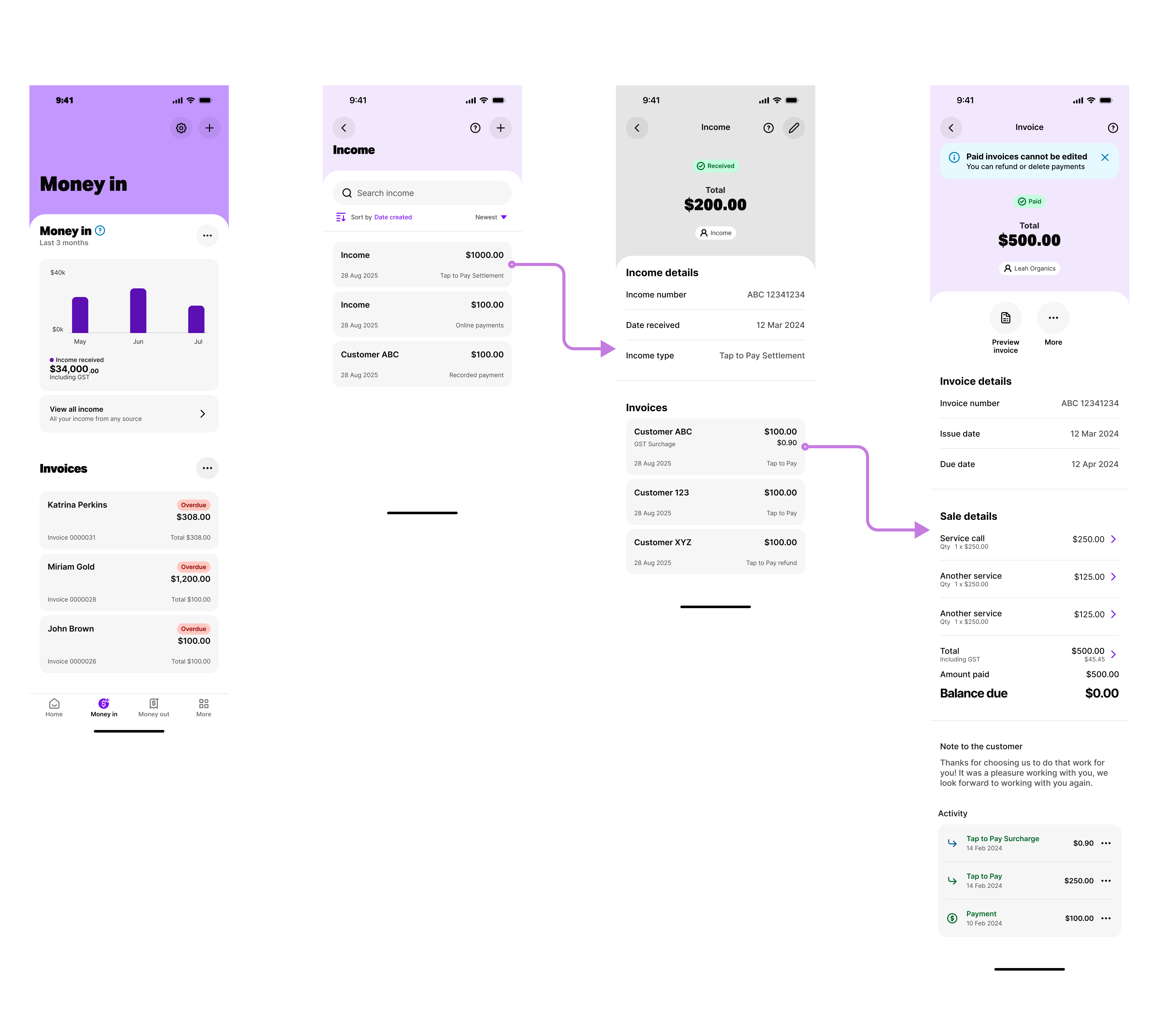 Using feedback and data from Sole traders who had been using other MYOB products as well as our initial project kickoff user interviews, we quickly discovered that the problem facing Sole traders was visibility over income. Without visibility over where money was coming from, sole traders had to jump between the different lists in the app, check individual invoices, and manually connect the dots to confirm what was paid and its source.